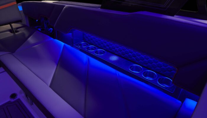 Crea un ambiente nocturno sofisticado en la cabina y la proa con iluminación indirecta oculta en los paneles laterales de la tapicería interior, que cuenta con color RGB seleccionable y tecnología LED de bajo consumo.